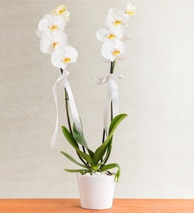 "Bir sürpriz, yüzlerde tüm gün yerini kaybetmeyecek bir gülümseme oluşturabilir mi? Çift dal Beyaz Phalaenopsis Orkide ile bu mümkün. Zarafetin ve asilliğin simgesi seramikte beyaz orkide ile siz de sevdiklerinize unutulmaz mutlulular yaşatabilirsiniz.